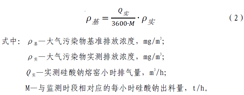 六、增加4.2.8 條,內(nèi)容為:純氧燃燒硅酸鈉熔窯應(yīng)監(jiān)測排氣筒中大氣污染物排放濃度、排氣量及相應(yīng)時間內(nèi)的硅酸鈉出料量,按式(2)換算為基準(zhǔn)排氣量(3600 m3/t 硅酸鈉)條件下的大氣污染物基準(zhǔn)排放濃度,并以此作為達標(biāo)判定依據(jù)。大氣污染物排放濃度、排氣量、產(chǎn)品產(chǎn)量的監(jiān)測、統(tǒng)計周期為1 h,可連續(xù)采樣或等時間間隔采樣獲得大氣污染物排放濃度和排氣量數(shù)據(jù),硅酸鈉出料量數(shù)據(jù)以企業(yè)統(tǒng)計報表為依據(jù)。